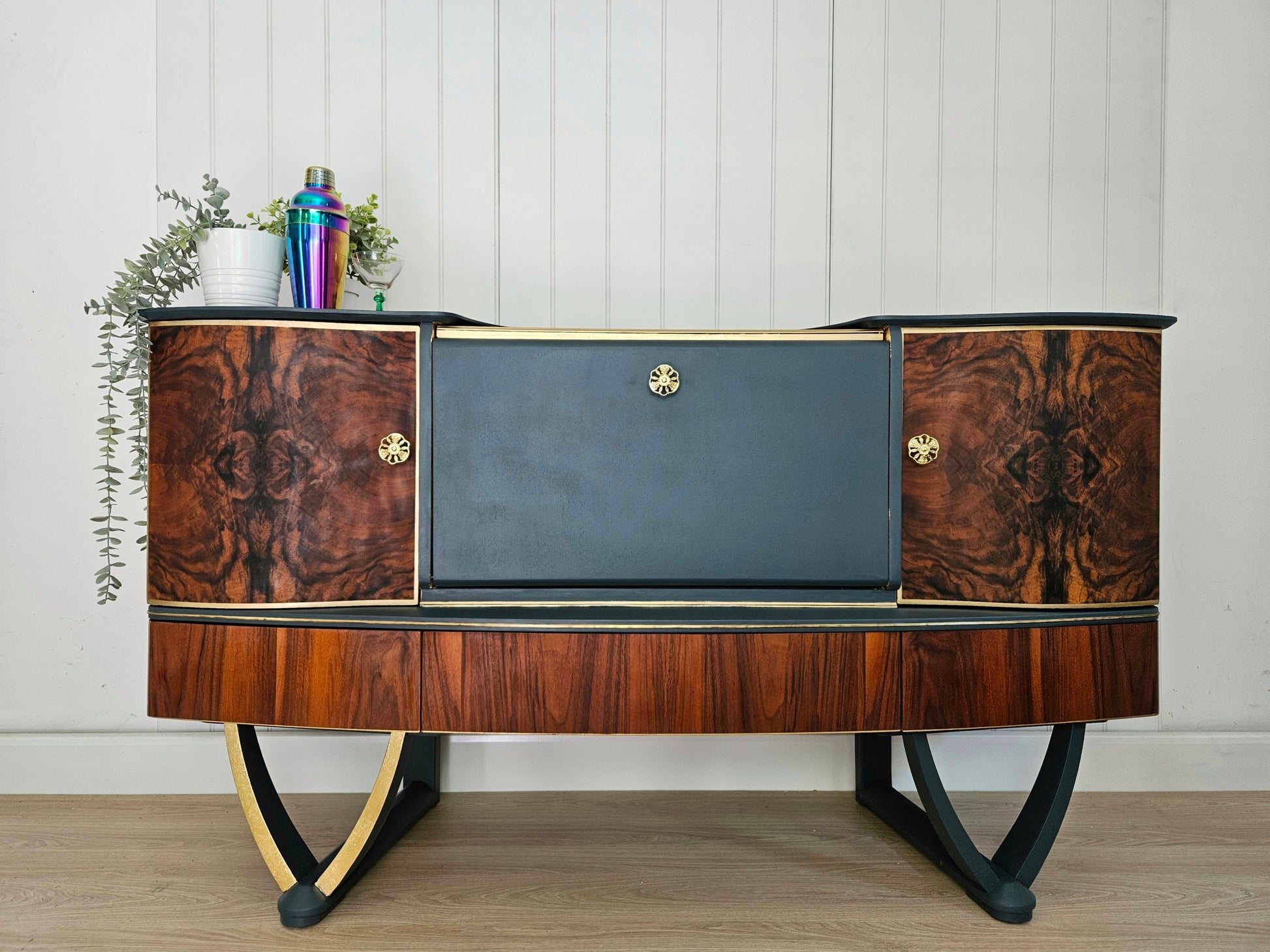 A beautiful beautility cocktail sideboard that has everything. Class, boldness of the grain, glamour from the gold leaf interior as well as functionality!