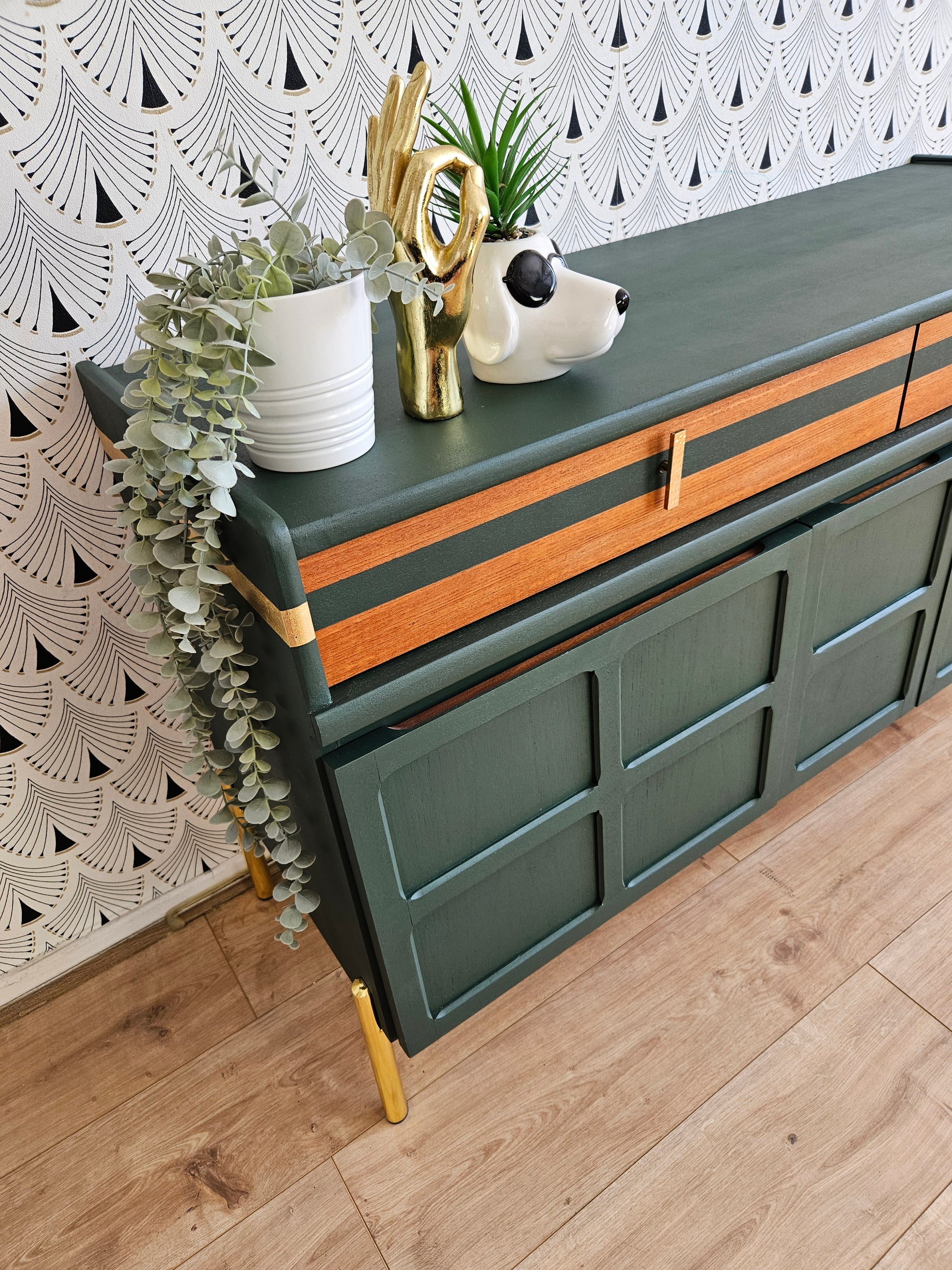Vintage Nathan squares teak sideboard painted in green with gold leaf accents to the sides.