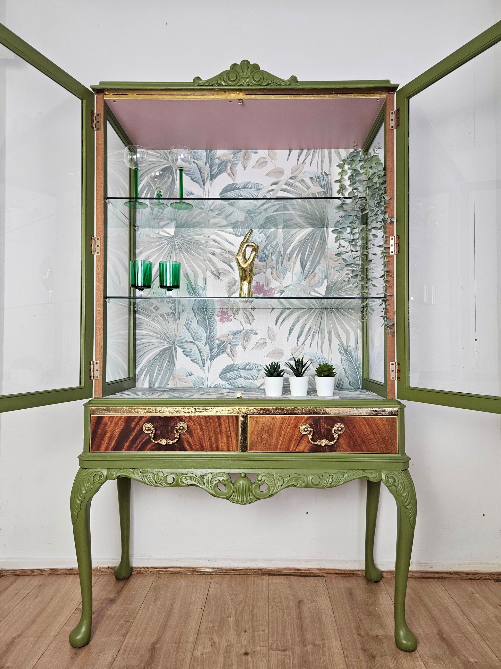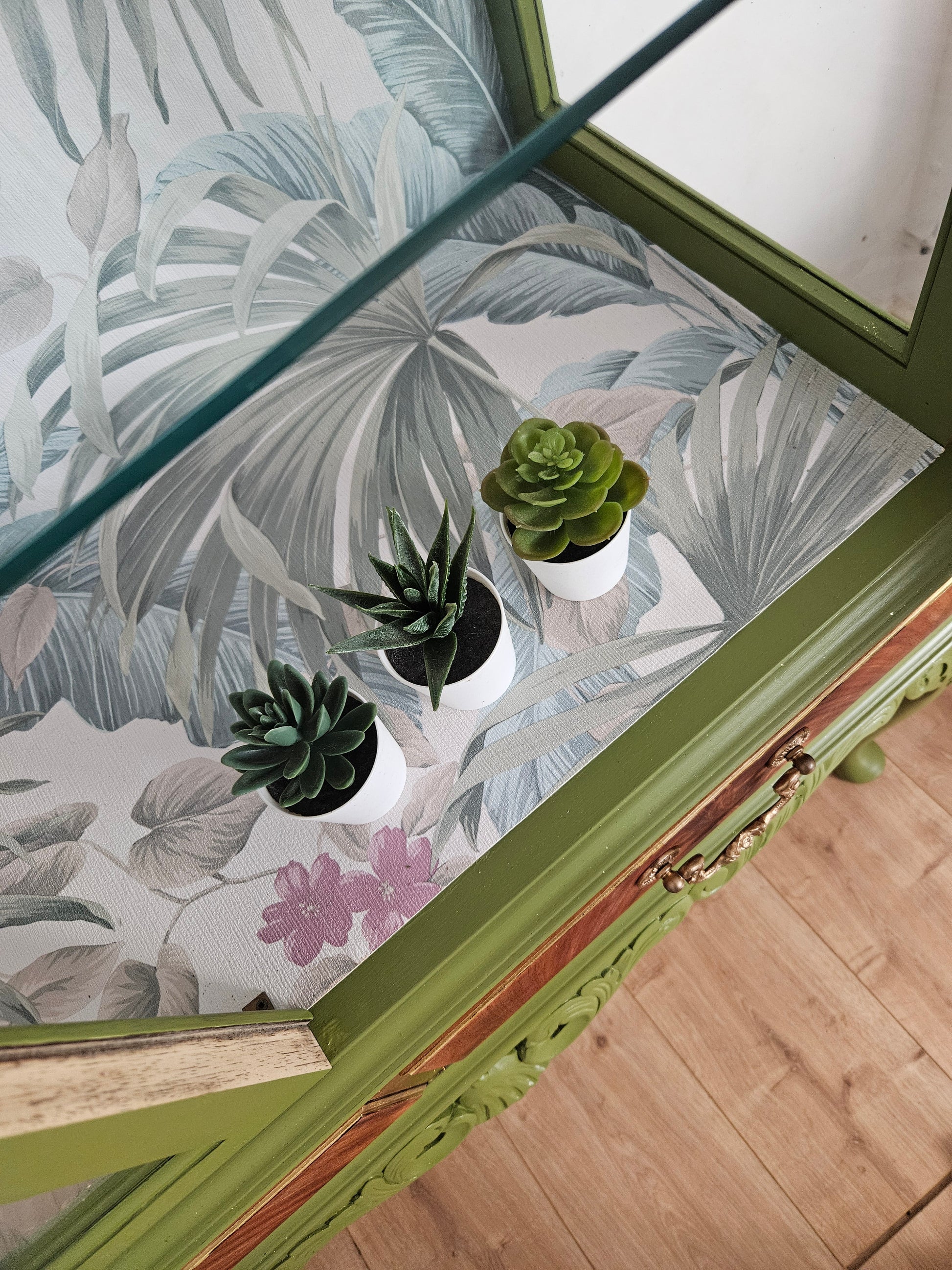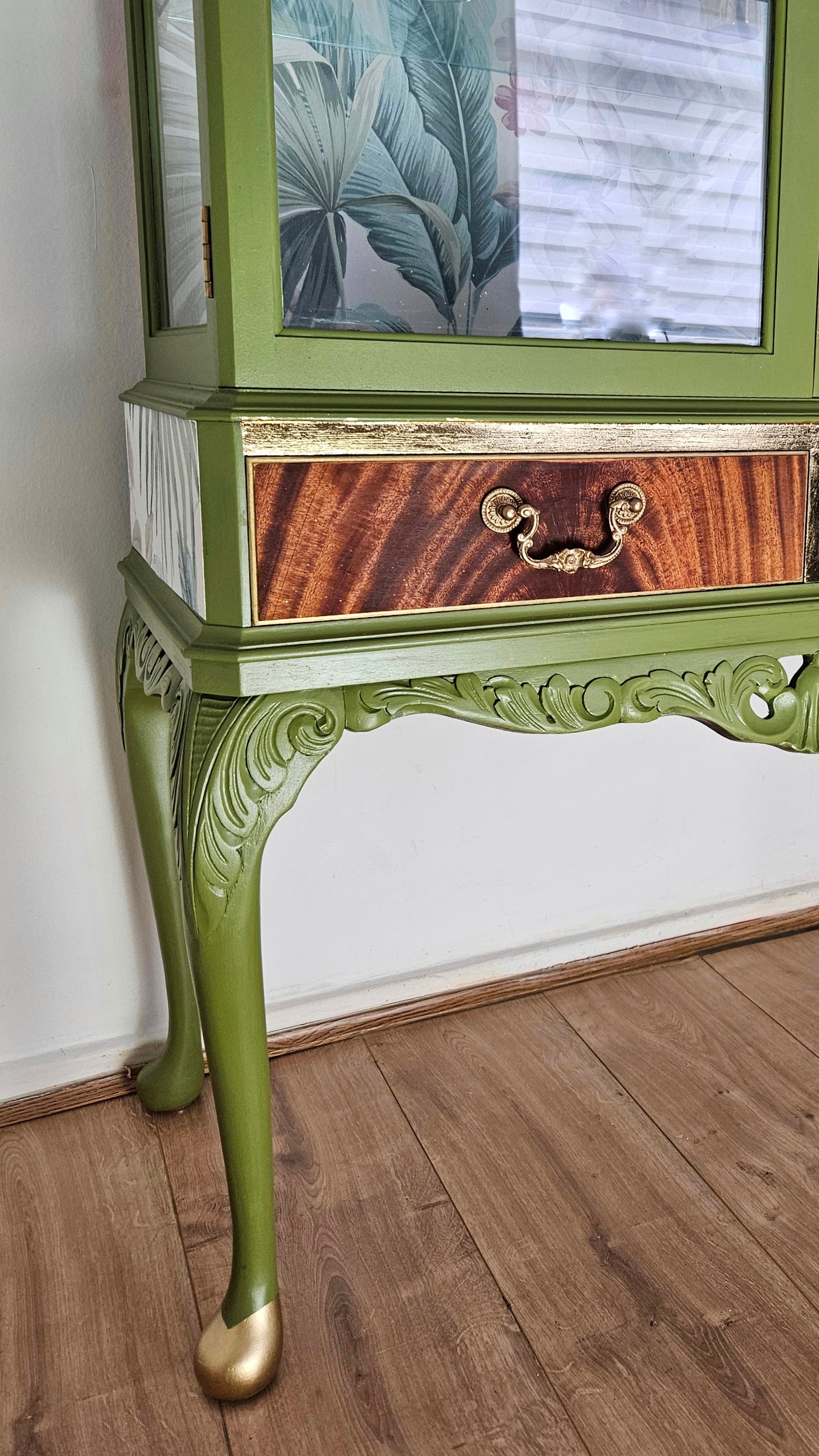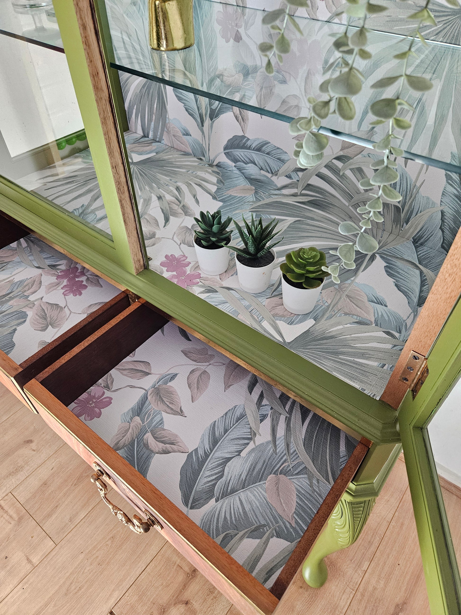 One off cocktail cabinet, lovingly painted in botanical green, pink and gold leaf. Inside has a beautiful leafy wallpaper design which compliments the paint colours. For added interest we have added this wallpaper to the sides of the cabinet and have also lined the drawers to tie everything in.. We have left the drawer fronts natural to show off that beautiful wood grain